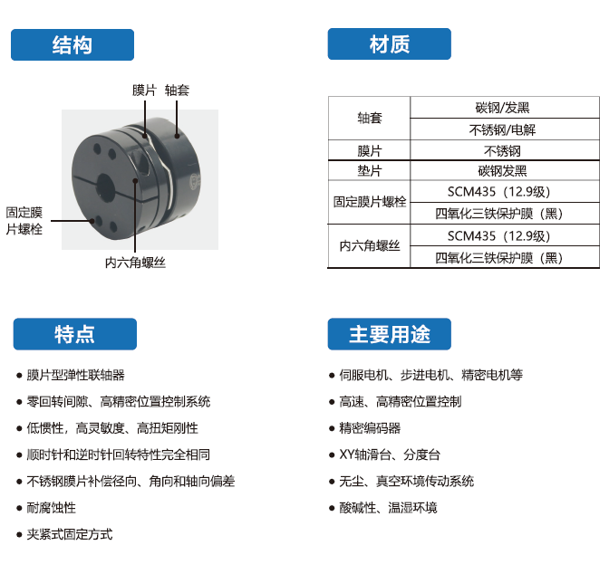DFPS-C系列聯(lián)軸器采用碳鋼發(fā)黑,利用脹緊套聯(lián)接的膜片型彈性聯(lián)軸器,廣泛用于伺服電機、步進電機、精密電機等。
