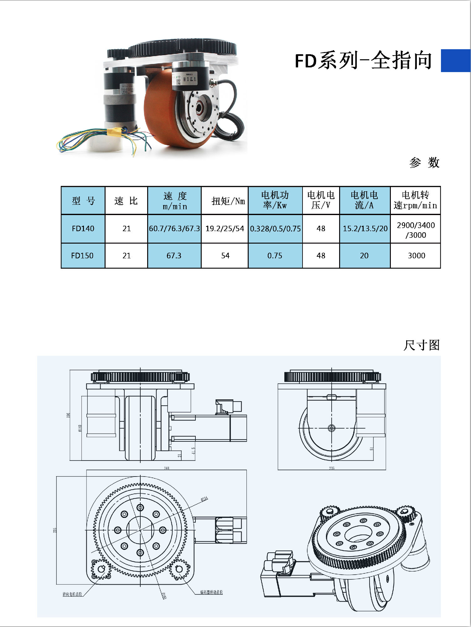 FD系列舵輪組,全指向型。采用差速驅(qū)動輪組模塊,將減速機(jī)與驅(qū)動輪設(shè)計為一體,加外接直流電機(jī),成為高度集成的機(jī)電一體化AGV行走驅(qū)動輪組組件。其結(jié)構(gòu)簡單,性能可靠,便于安裝。