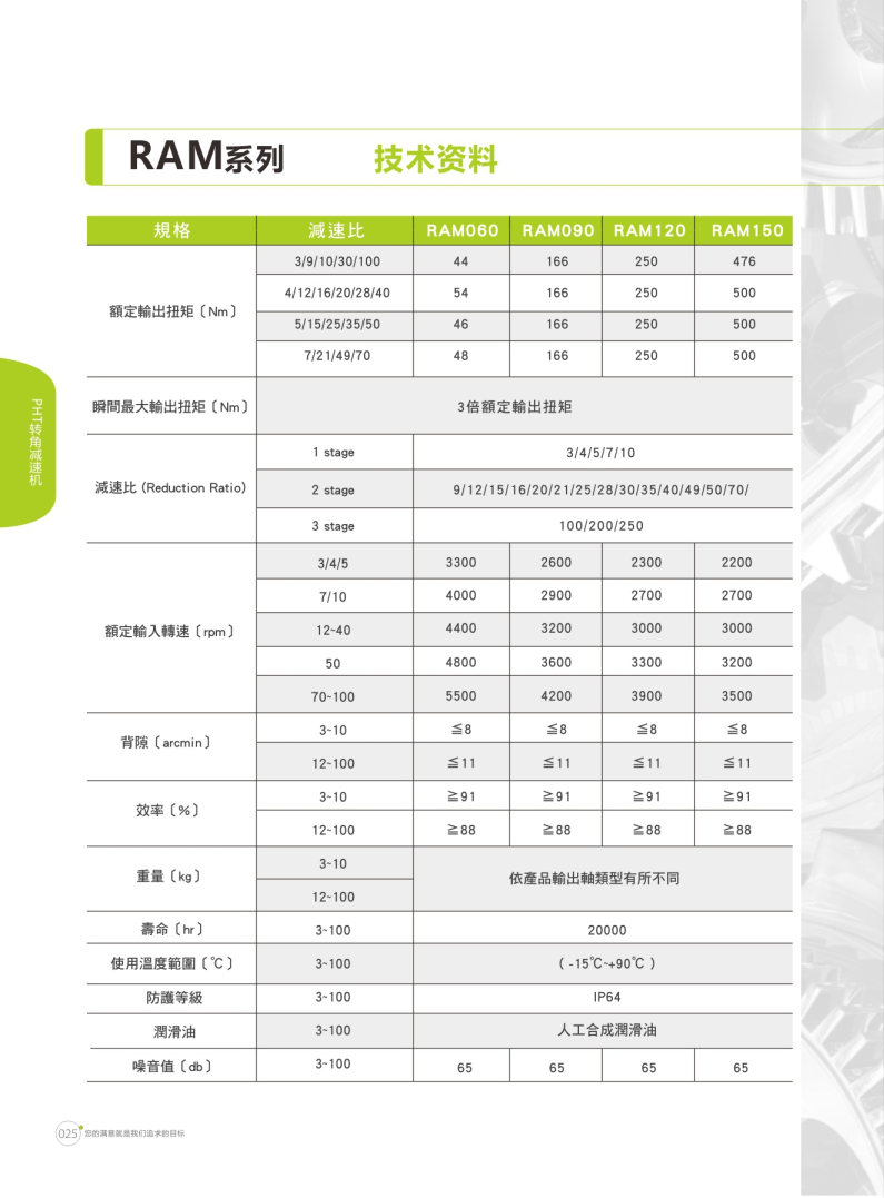 RAM系列是品宏轉(zhuǎn)角減速機(jī)系列。 鋁合金材質(zhì)可提高散熱能力,減緩溫升現(xiàn)象造成影響。 多樣化的出力軸可因應(yīng)各種場(chǎng)合,客制化的入力端可搭配各式馬達(dá)。 提供各式特色之減速機(jī),供使用者依需求選購(gòu)。 特殊油封設(shè)計(jì),正常使用下不需保養(yǎng)亦不用更換潤(rùn)滑油,可延長(zhǎng)使用壽命。 各式特色,體積小,省空間,噪音低,輸出扭矩高,安裝容易,可搭配馬達(dá)型號(hào)廣泛。 RAM搭配DM,一體成型的齒輪組,可有效的減低噪音。 RAM搭配DH,最佳的性?xún)r(jià)比,可廣泛應(yīng)用于各種場(chǎng)合。
